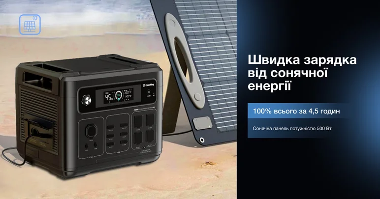 Зарядна станція ColorWay CW-PR-2K2W-01 підтримує екологічну швидку зарядку від сонячних панелей. Використовуючи панель потужністю 500 Вт, ви зможете повністю зарядити станцію всього за 4,5 години. Крім того, пристрій підтримує зарядку від різних джерел: стандартної розетки, автомобільного прикурювача, зовнішніх акумуляторів чи генератора, що робить її універсальним рішенням для будь-якої ситуації.