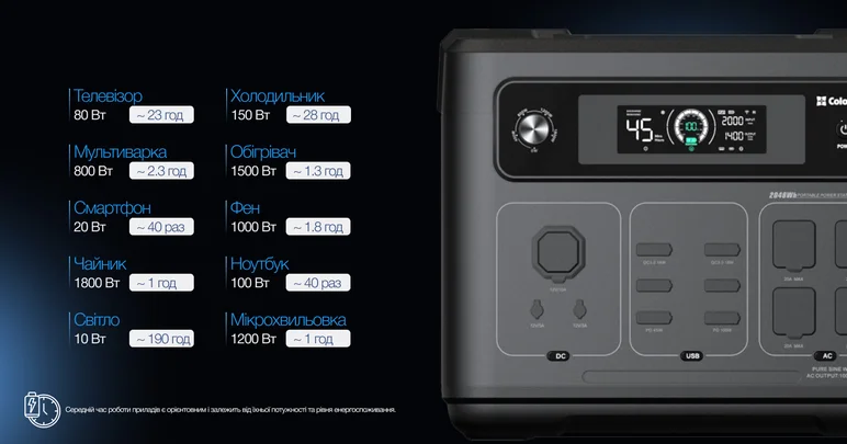 Завдяки ємності акумулятора в 2048 Вт·год та потужності 2400 Вт, вона здатна живити до 90% ваших пристроїв, включаючи побутову техніку, електроінструменти та гаджети.
