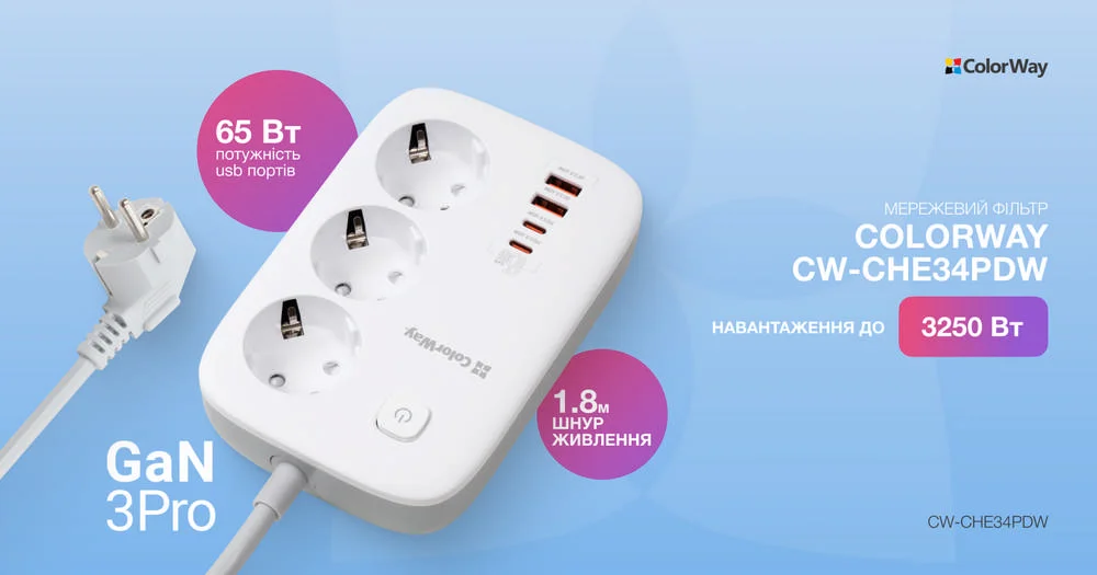 Мережевий фільтр-подовжувач СolorWay 3 розетки/4USB GaN3 Pro PD (2USB-A + 2 TYPE-C) (65W) 2M (CW-CHE34PDW)