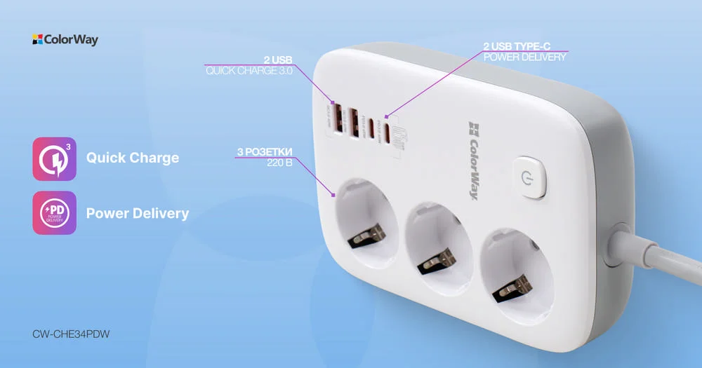 Компактний подовжувач з трьома розетками 220В і з 2 портами USB, що підтримують технологію швидкої зарядки Quick Charge 3.0/4.0, і 2 USB-C PD з підтримкою протоколів PD (Power Delivery) 2.0/3.0, 65W PPS; APPLE FAST CHARGE; SAMSUNG 5V-2A/AFC/SFC; QC2.0/3.0/4.0+; HUAWEI FCP/SCP, VOOC, XIAOMI 27W TURBO CHARGING.