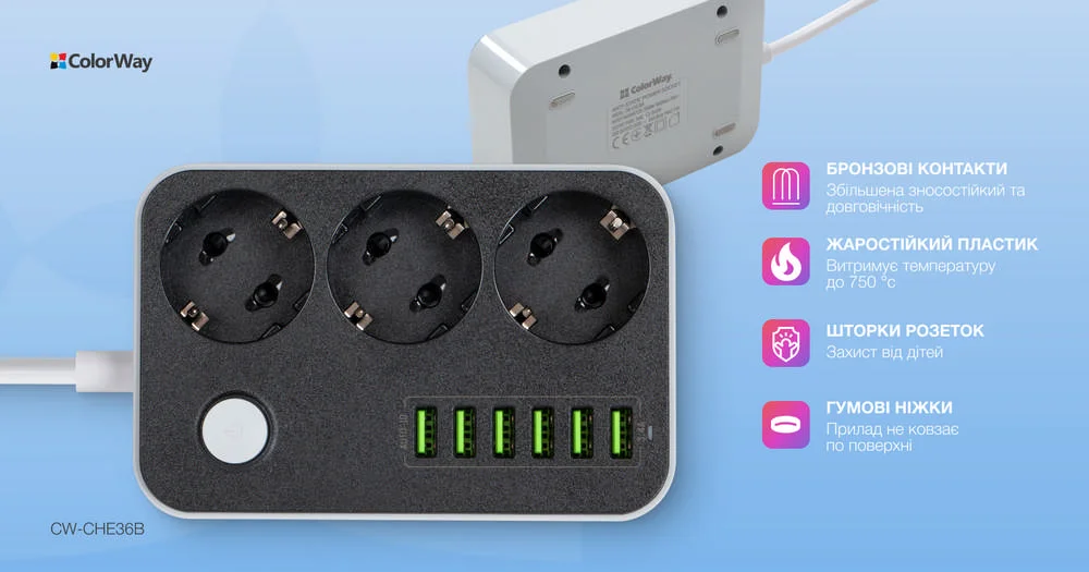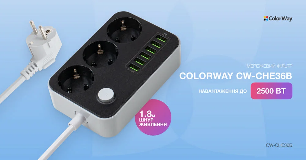 Мережевий фільтр-подовжувач СolorWay 3 розетки/6USB (CW-CHE36B)