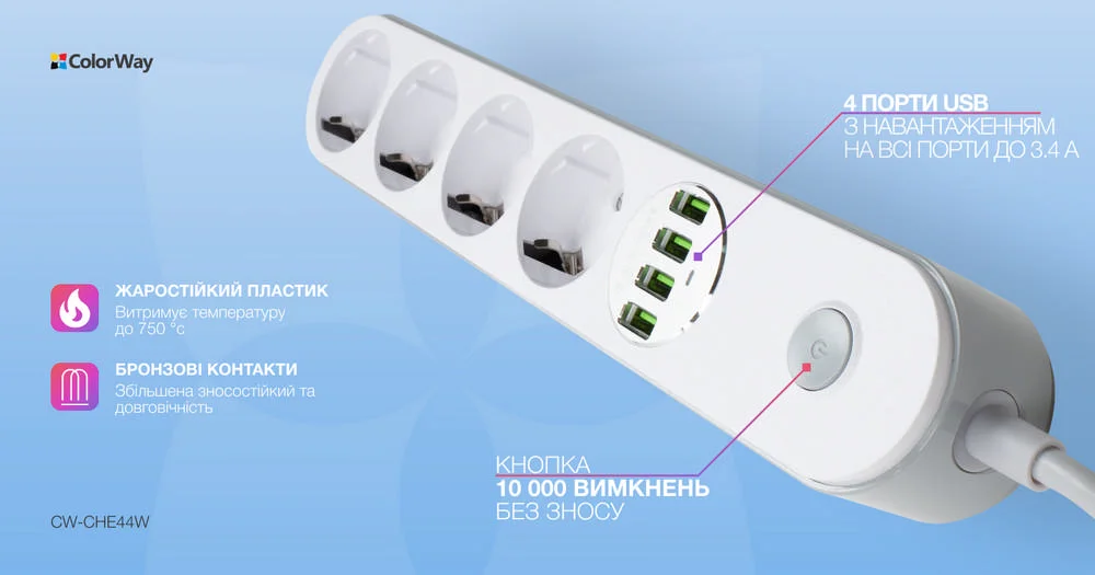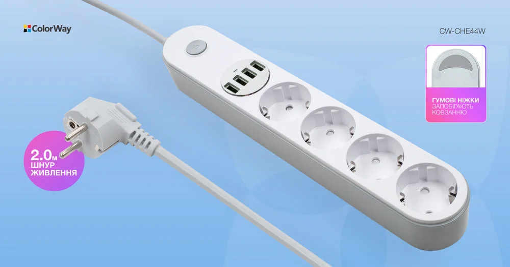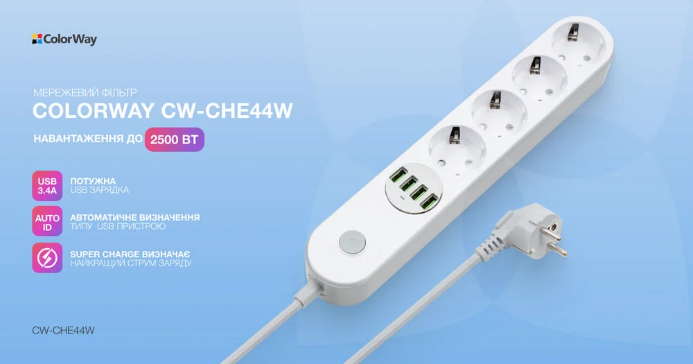 Мережевий фільтр-подовжувач СolorWay 4 розетки/4USB (CW-CHE44W)